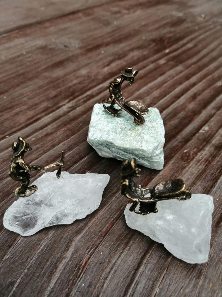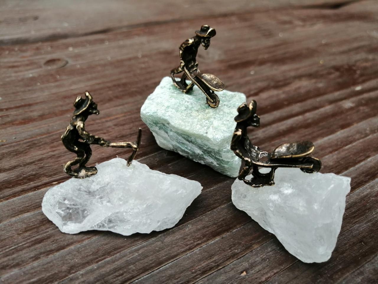 Přicházíme s kolekcí dalších hornických suvenýrů. Po kamíncích s mlátkem a želízkem, které potěší hlavně děti, tu je zase něco pro dospělé návštěvníky. Mosazné figurky horníků na neopracovaných křišťálech a dalších minerálech.